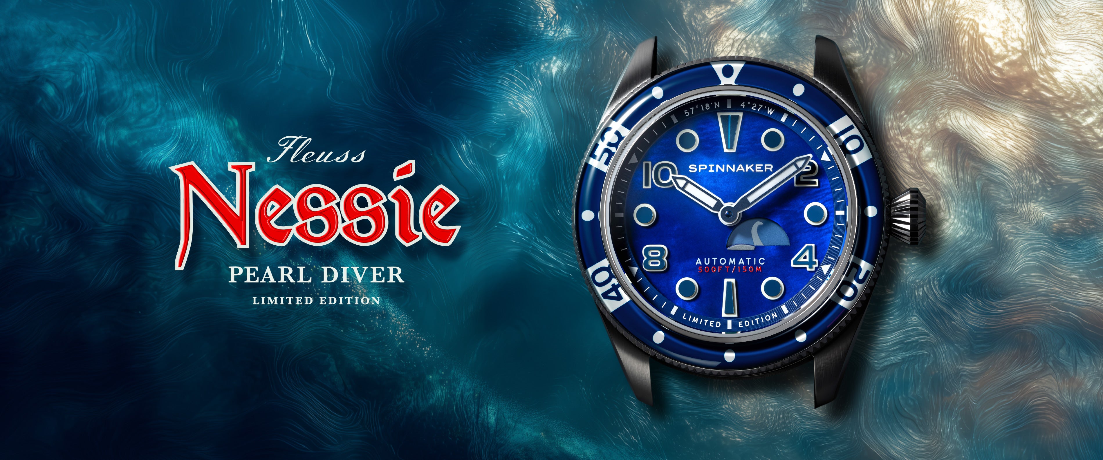 Spinnaker Watches proudly announces the release of the Fleuss Automatic Nessie Pearl Diver Limited Edition, a collaboration with Scottish Watches. Limited to 650 individually numbered pieces.