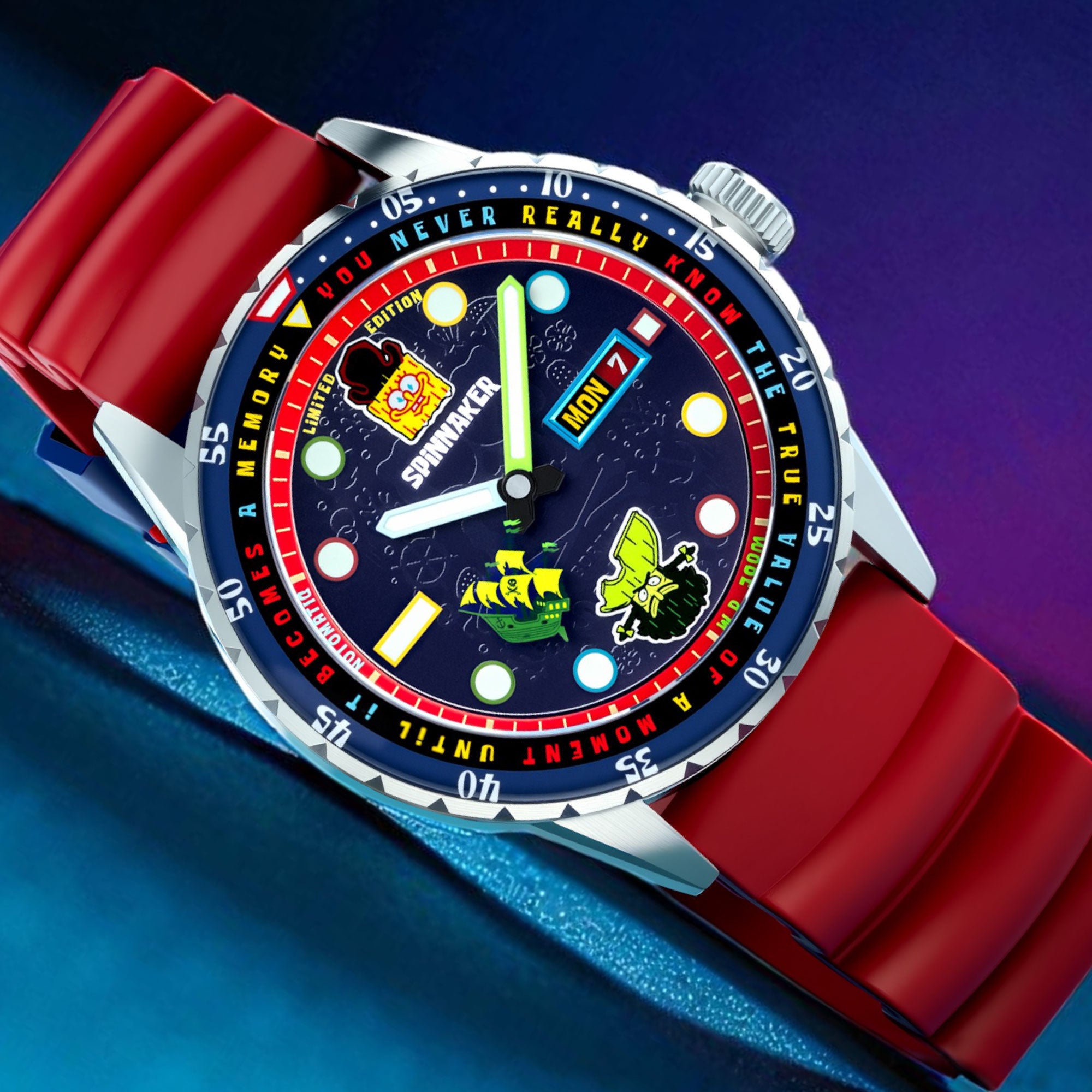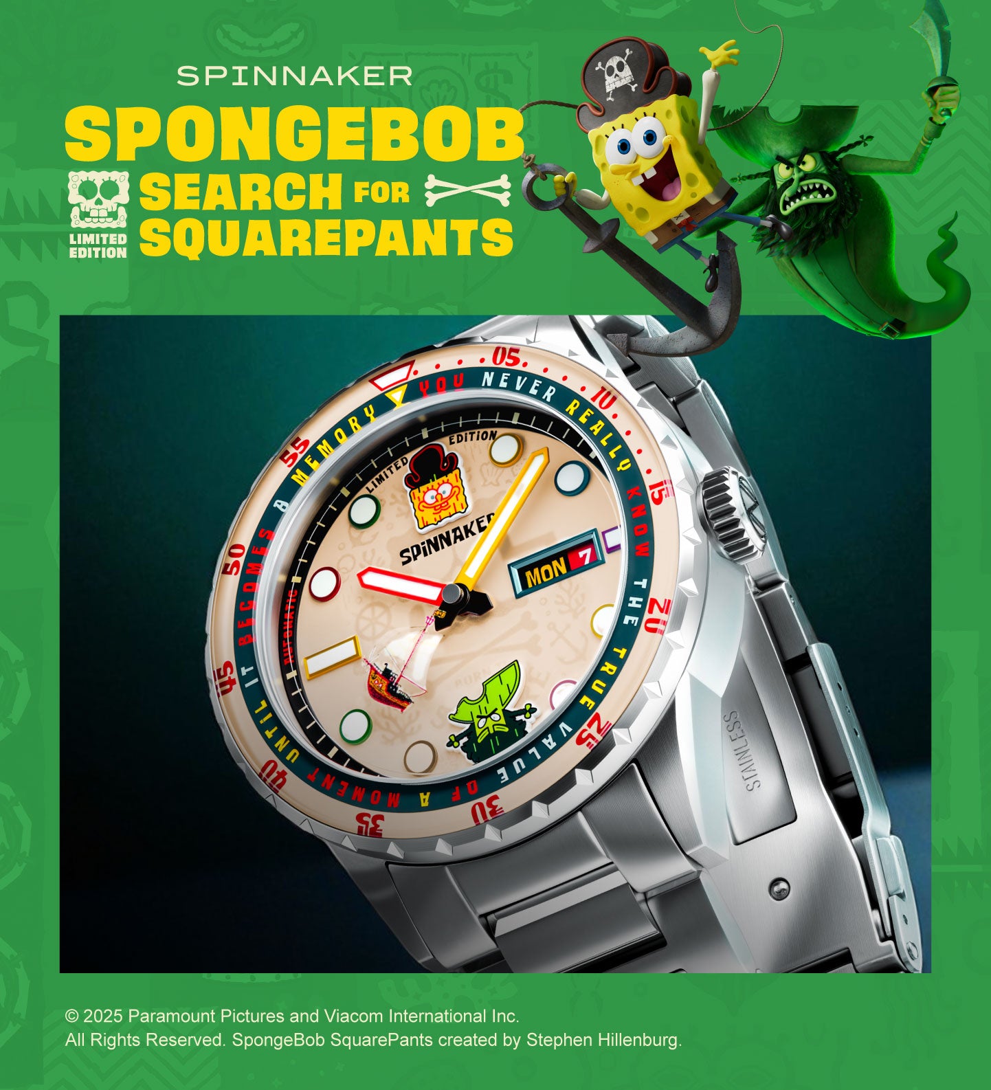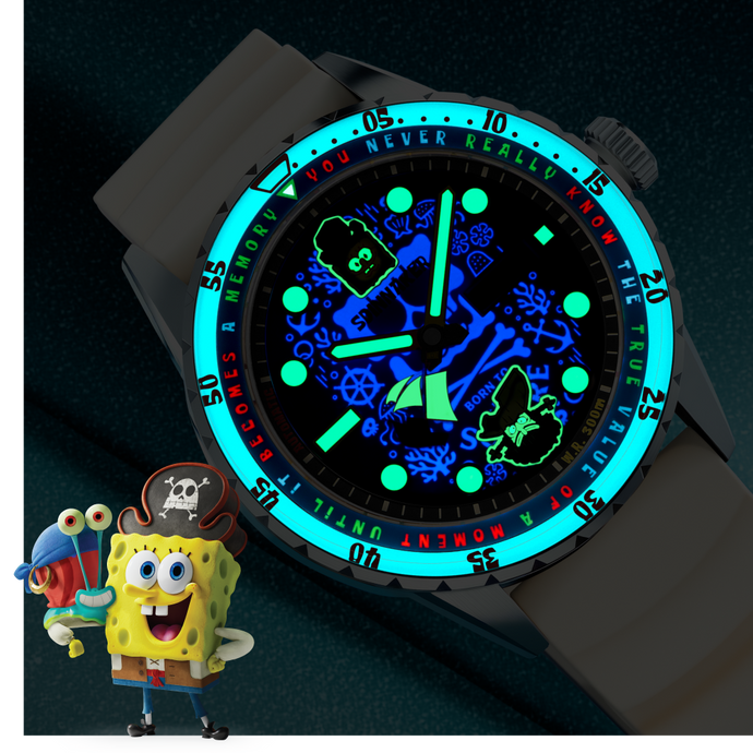 UV-revealed Pirate SpongeBob. Swiss luminous glow. Inside beats the heart of precision: the Japanese Automatic movement.