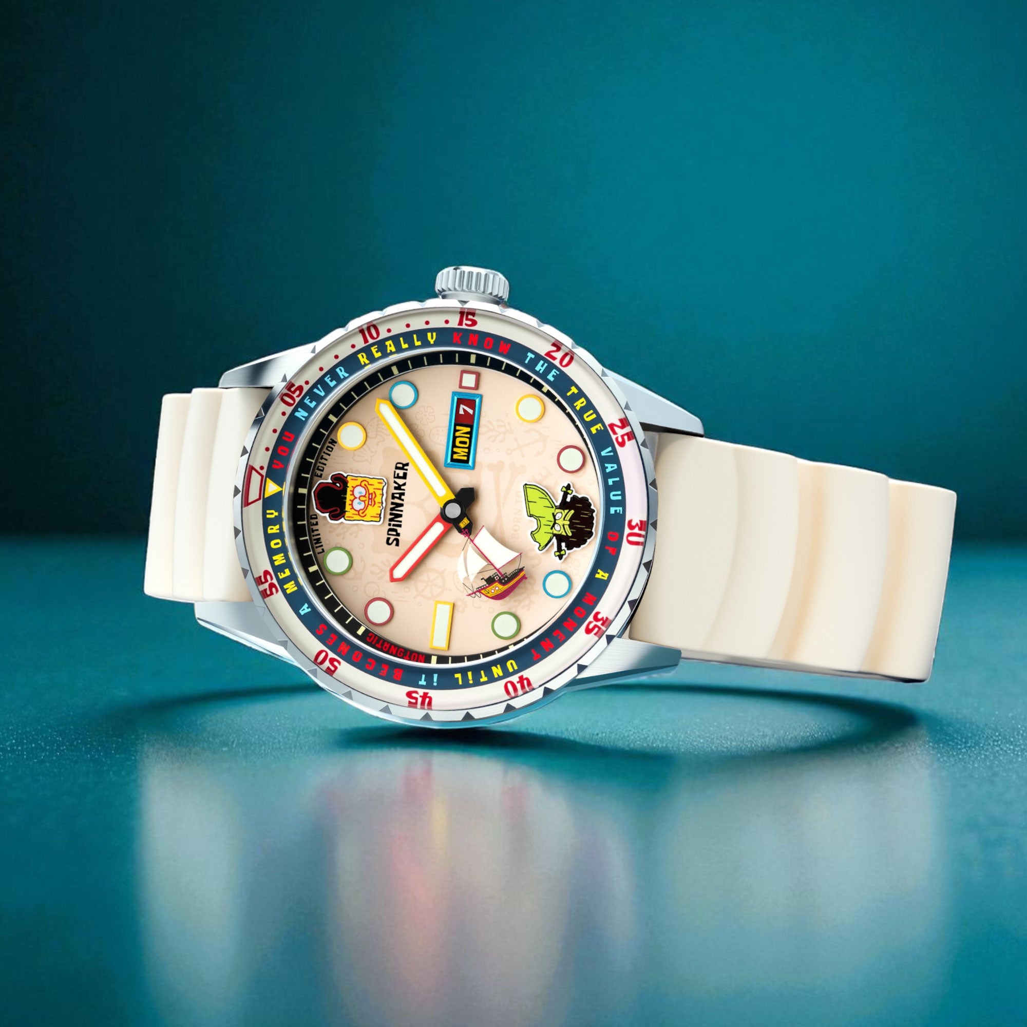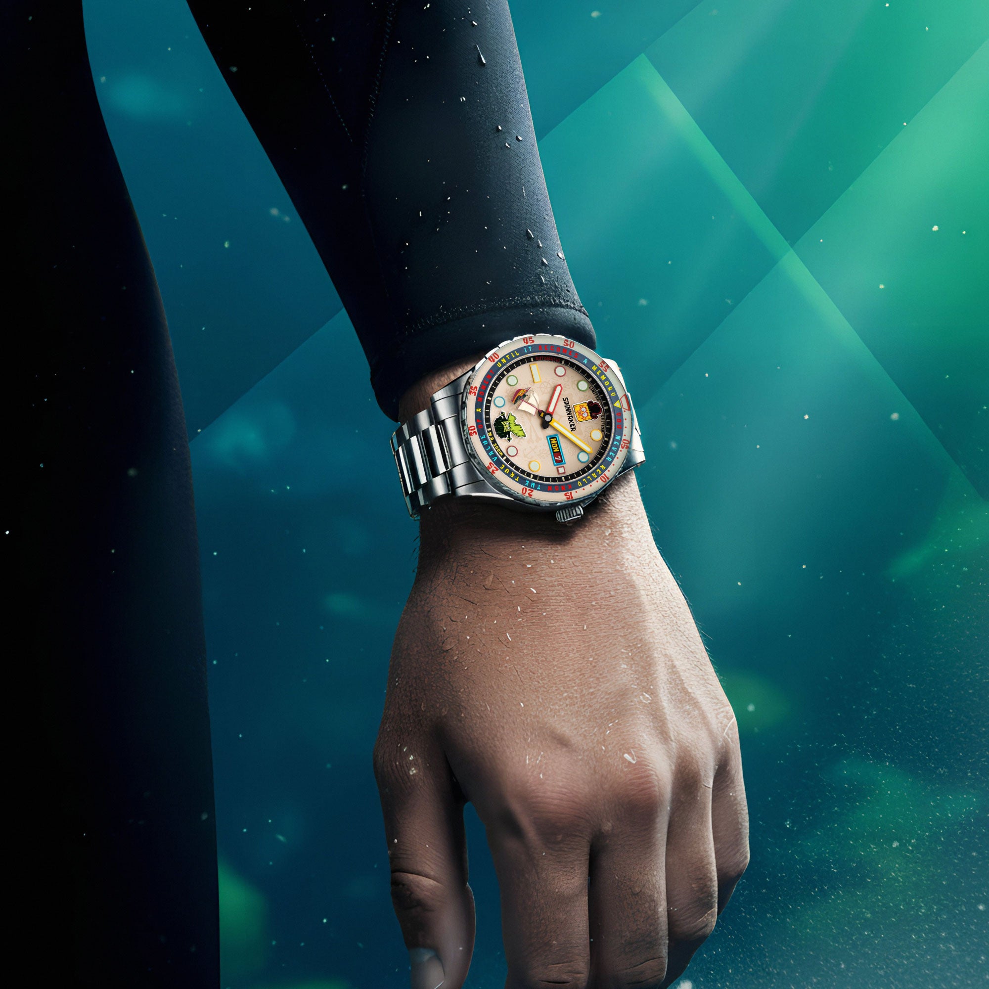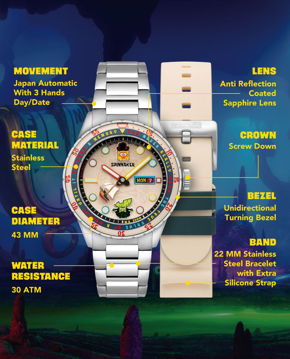 UV-revealed Pirate SpongeBob. Swiss luminous glow. Inside beats the heart of precision: the Japanese Automatic movement.