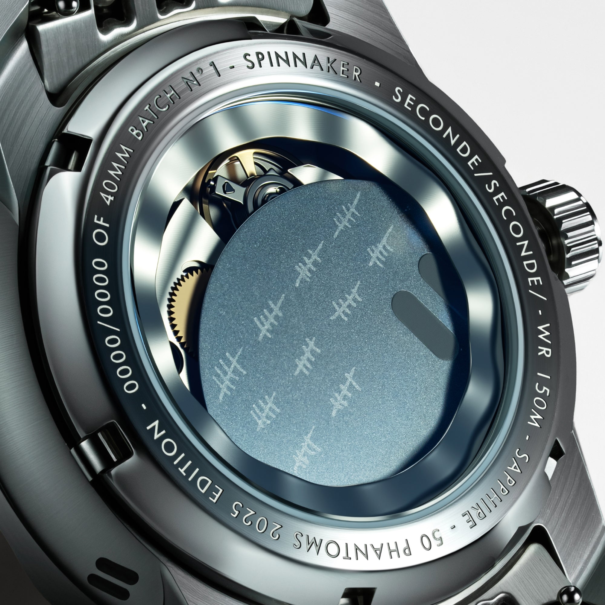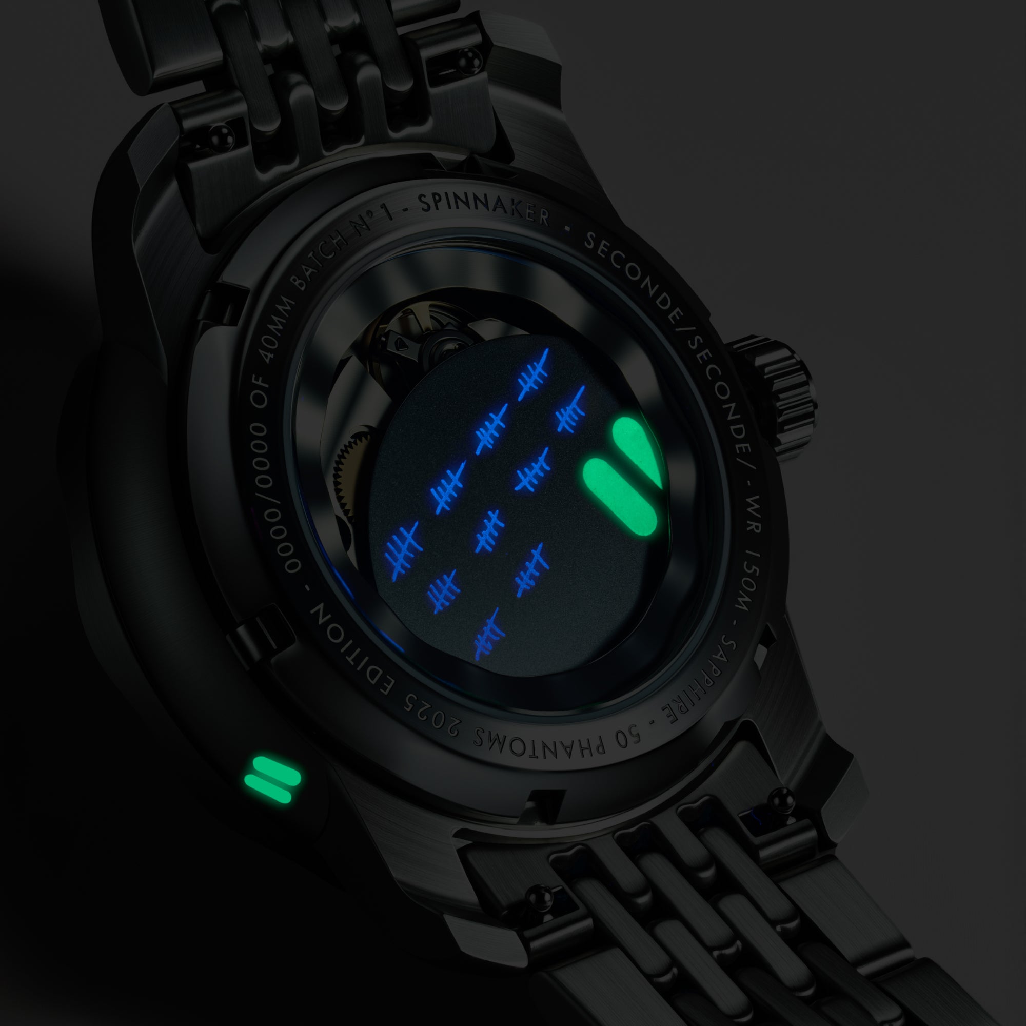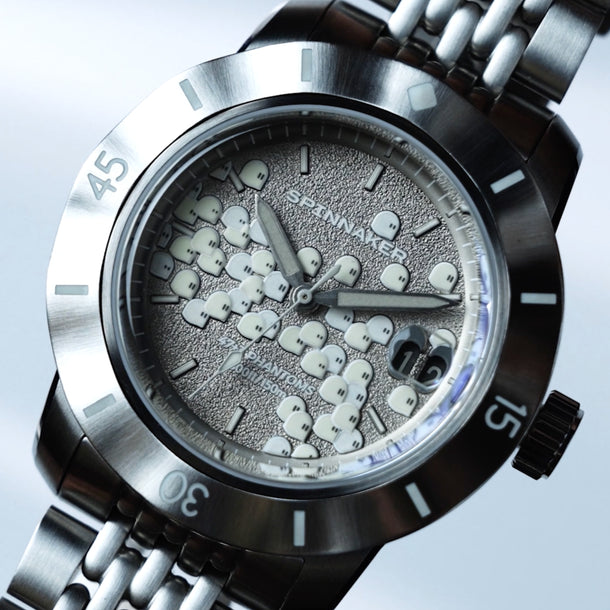 Spinnaker once again invites the spectral imagination of Parisian watch artist Romaric André - better known as Seconde/Seconde/. Available in 40mm and 43mm case size, both variants carry forward the unmistakable “phantom” dial, cloaked in spectral gray - where glowing ghosts flicker to life in the dark.